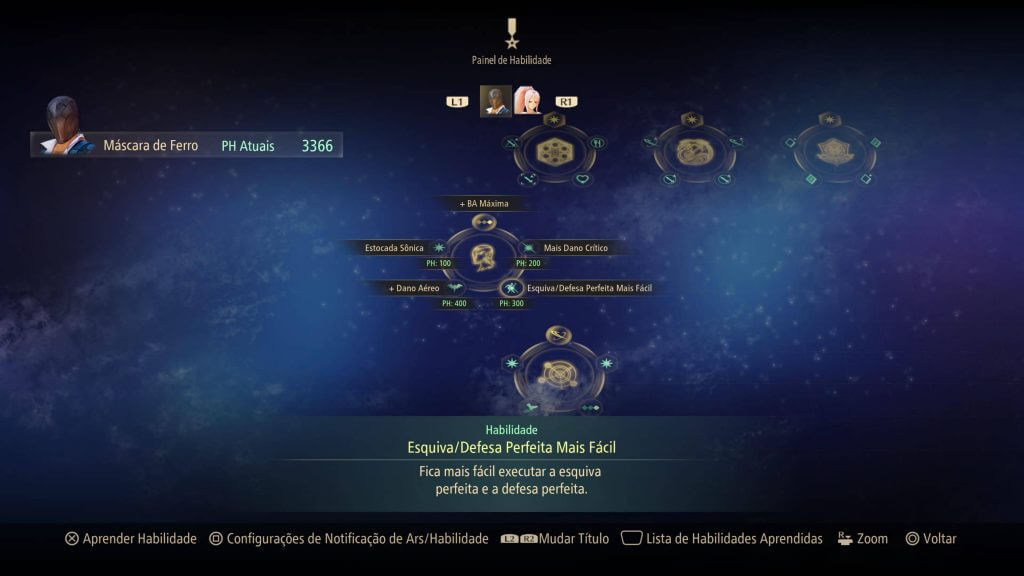 Por mais que no jogo tenha o sistema clássico de “level up”, suas habilidades, efeitos passivos e etc… Não são liberados de acordo com o seu nível. Você libera depositando “pontos de habilidade” em alguma das habilidades presentes em algum dos emblemas. Por exemplo, eu liberei o emblema que traz um golpe novo, maior dano em inimigos atordoados e resistência contra veneno. Terei que pagar uma quantidade X de pontos para obter cada uma das habilidades individualmente. Após completar o emblema, consigo a habilidade única pertence a essa “árvore”.