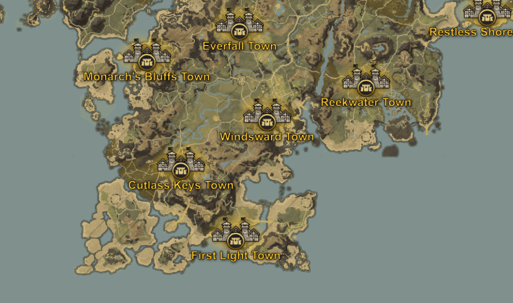 Em New World, você começará o jogo em uma das quatro regiões iniciais próximas a um dos quatro assentamentos: Primeira Luz (First Light), Guardaventos (Windsward), Falésias do Monarca (Monarch’s Bluff), ou Queda Eterna (Everfall). Nesse primeiro momento você vai passar por quests iniciais que basicamente vão te introduzir aos aspectos básicos do jogo como lutar, caçar, coletar e criar itens. Faça essa série de missões o mais rápido possível e, então, o jogo vai te levar ao assentamento mais próximo, a depender da região inicial.