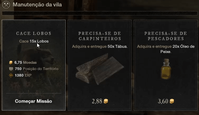 Entre as opções de missões da cidade e da facção, lembre-se de focar nas mais eficientes, ou seja, as que sejam mais fáceis de serem realizadas no caminho para suas missões de história e que recompensem com o máximo de pontos de experiência possível. Veja que nos exemplos abaixo a missão de caçar 15 lobos dá muita experiência.