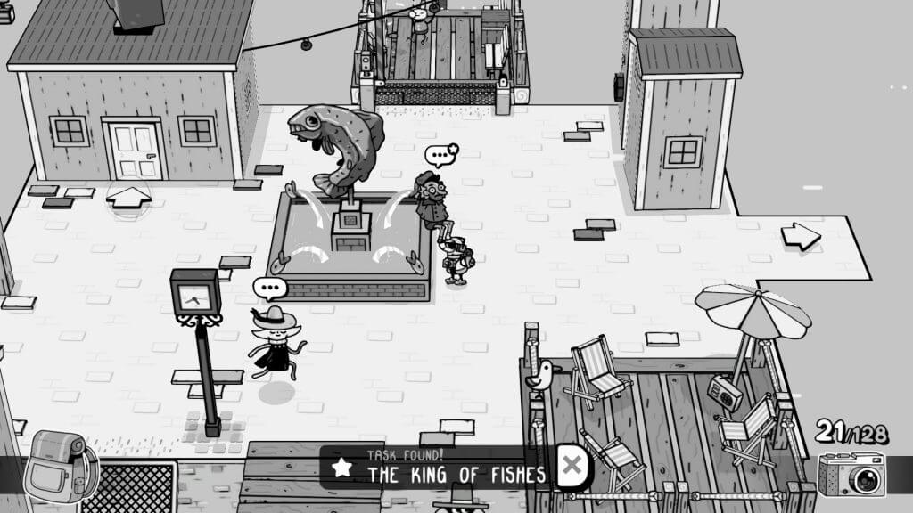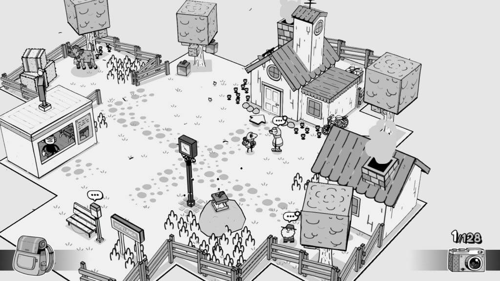 O mesmo se repete nos cenários, que por sua vez, são em 3D. TOEM possui ambientes bem comuns no mundo dos games: uma cidadezinha aqui, uma floresta acolá, uma praia, uma cidade grande e, por fim, uma montanha. No entanto, tudo novamente tem seu charme. Os cenários receberam toques e boas referências à cultura e ambientação escandinava. Além disso, o modo como são desenhados, animados e preenchidos com personagens, fazem parecer que você está fazendo parte de uma grande tirinha de jornal. Sabe aquelas tirinhas mais antigas que ocupavam quadros maiores? Quase um “Onde está Wally?” em preto e branco. Ou algum desenho animado clássico.