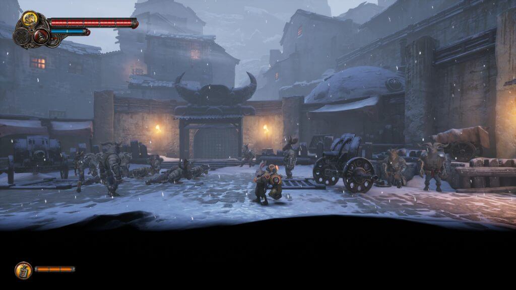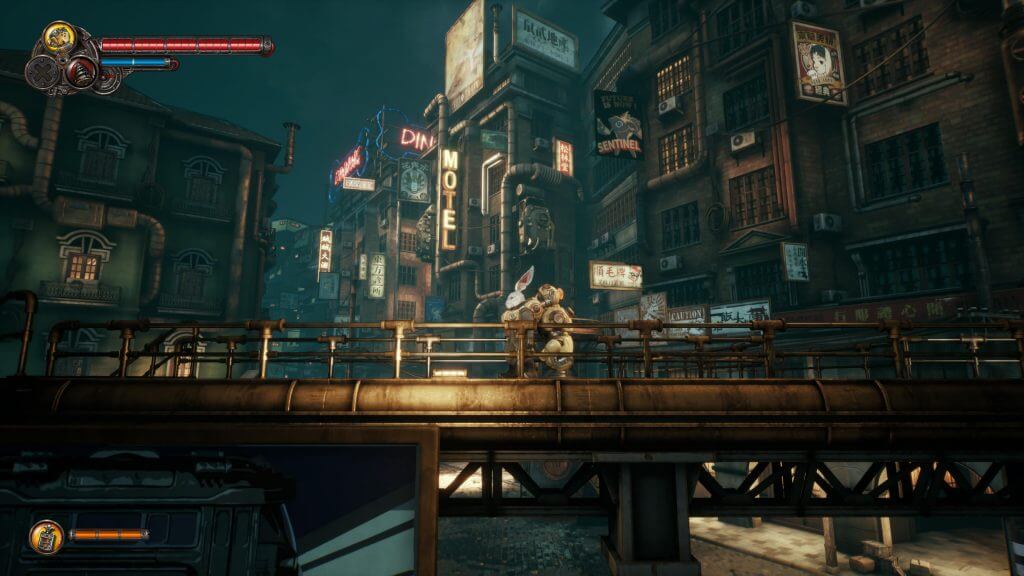 Tudo isso se passa em um mundo até muito vivo para o gênero. As cidades dieselpunk e seus habitantes parecem estar sempre vivas quando você está na superfície. Uma pena, inclusive, não termos mais interações nas ruas e na cidade em si, que vemos ao fundo.