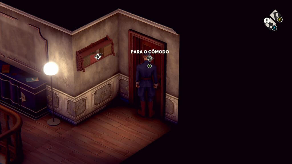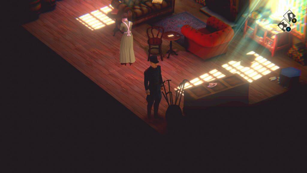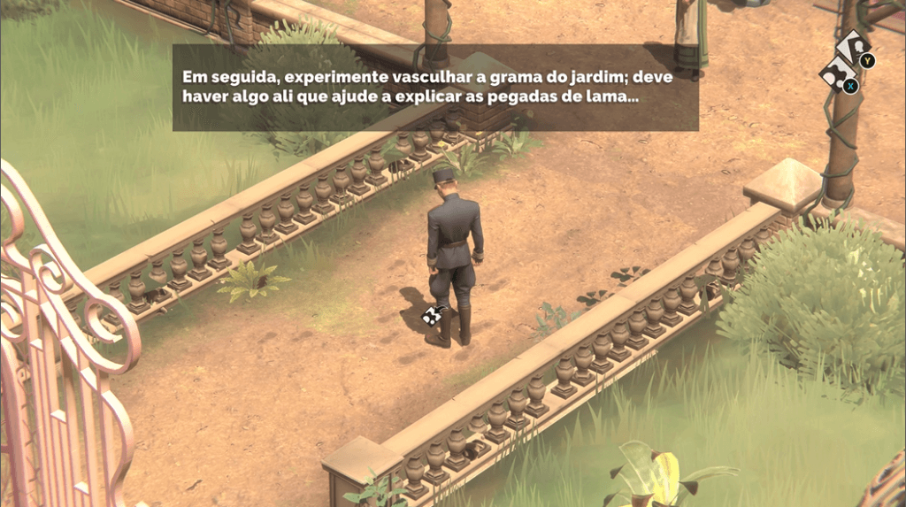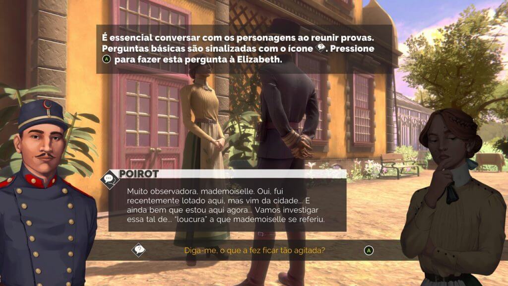 Tem um botão para ação, para interagir com os elementos do jogo (pessoas, pistas, objetos, etc). Isso é maravilhoso, pois simplifica o gameplay e agiliza demais as buscas. Como os itens são bem visíveis, você não precisa esmagar botões loucamente para procurar pistas. Existe um outro botão para acessar o mapa mental do caso e outro para ver o perfil das pessoas investigadas e as conclusões que Poirot conseguiu fazer, ao analisar as pistas. E, para finalizar, os botões de gatilho servem para dar Zoom In e Zoom Out nas cenas.