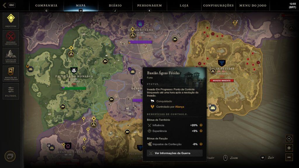 Existem algumas maneiras de amenizar essa barreira financeira. Você pode subir de nível em cada região. É um sistema particular dentro do New World, onde você ganha alguns bônus em cada área ao completar algumas conquistas. Um dos bônus possíveis é diminuir os impostos da zona; outros são ganhos de XP aumentados, velocidade de coleta diminuída, etc. Outra maneira de enfrentar os impostos abusivos é ajudando sua Facção a obter o controle do território.