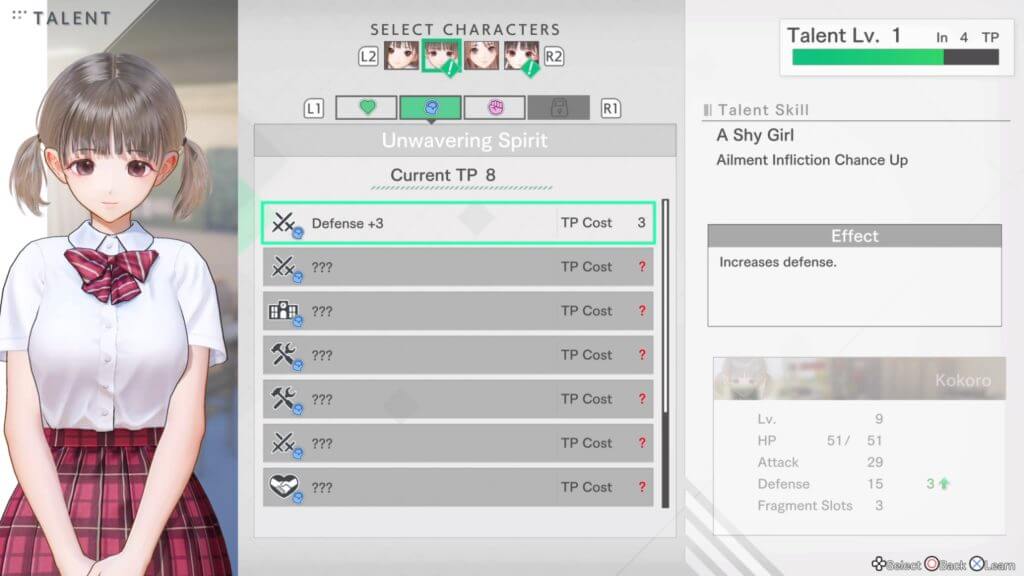 Fora dos combates e da exploração de dungeons, o jogador pode explorar a escola (que é bem grande por sinal), completar side quests para conseguir TP, construir novas estruturas, etc…, sendo uma ótima forma de passar o tempo fora das dungeons. Como eu disse acima, todas às vezes que completar side quests das personagens, o game lhe garante TP (Talent Points), os TP lhe permitem um upgrade nos status das personagens (HP, SP, DEF e novos poderes ativos e passivos).