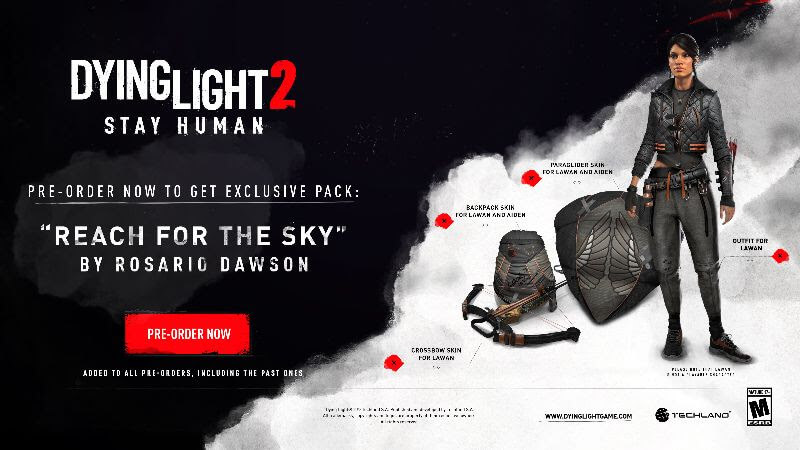 Além da apresentação do trailer em CGI, a Techland também revelou o pacote de skin exclusivo “Reach for the sky”. Todo jogador que fizer a pré-compra do jogo receberá esse pacote adicional, criado juntamente com Rosario Dawson (O Mandaloriano, Sin City, Demolidor), que interpreta Lawan, uma cidadã independente que acaba tendo o destino conectado com o do protagonista Aiden. O pacote “Reach for the Sky” contém uma roupa exclusiva, arma, mochila e skins para o parapente.