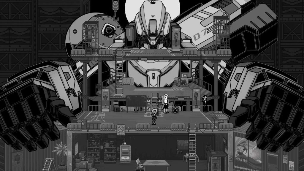 Como foi mencionado anteriormente, o jogo é totalmente em preto e branco. E isso não atrapalha a sua qualidade, já que te possibilita colocar que você comece a pensar em como seria as cores desses personagens alucinantes e criar mentalmente a sua própria paleta de cores com os tons que mais te agrada. Além disso, quando estamos sobre o comando de Shade somos entregues a cenários e personagens pixelados, porém, quantidade considerável de detalhes. Quando estamos pilotando o Cowboy junto de Knife, temos molde mais detalhados.. E isso faz todo sentido, já que as estrelas do show são os mechas que estão em combate.