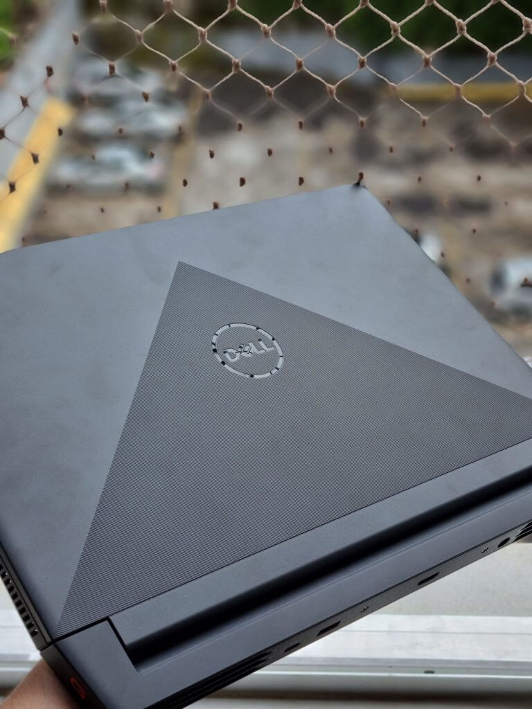 A Dell acertou no design da linha G15. Enquanto alguns modelos gamers e algumas fabricantes cismam em vir cada vez mais chamativos, com barras de LED RGB, tampas com vincos e relevos muito chamativos, jogo de cores que se destacam demais e outras alegorias carnavalescas, alguns notebooks gamers recentes, incluindo a linha G15 como um todo, vem focando em uma sinergia muito bacana em gamer e profissional, destacando uma coisa ou outra mas no geral mantendo o design sóbrio.