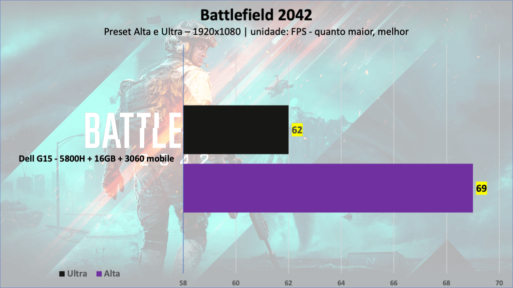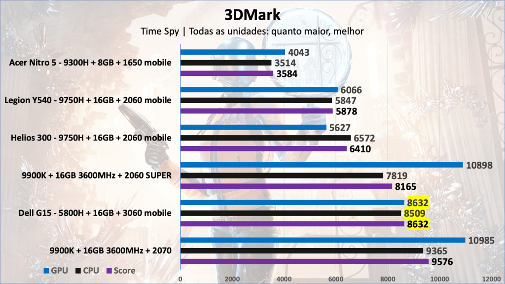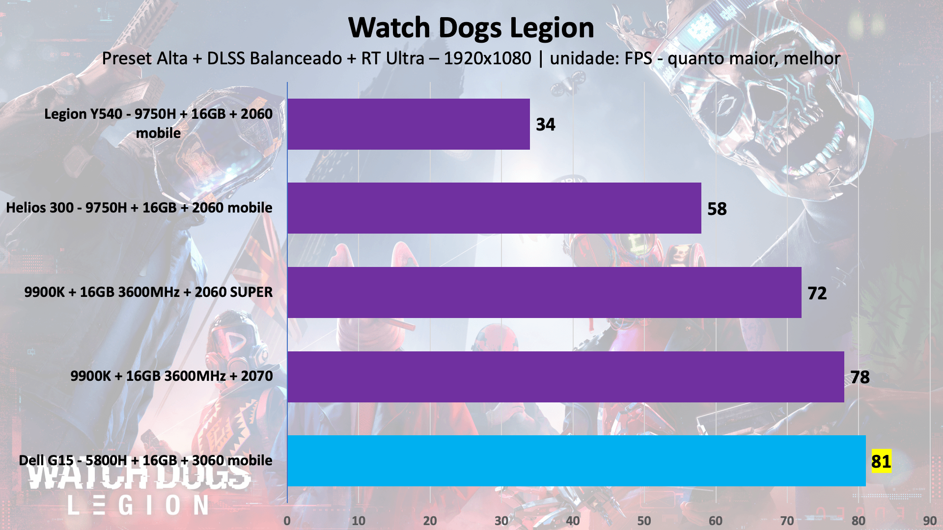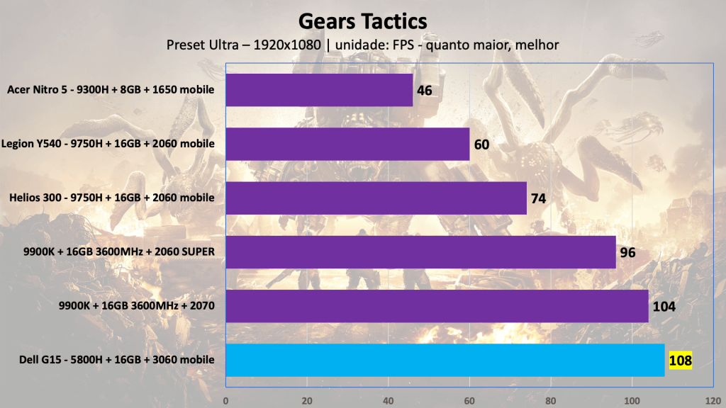 Por que falei isso? O Dell G15 com RTX 3060 possui uma das melhores TDPs do mercado para essa placa, podendo chegar até 125W, e ficando na média nos jogos sempre acima dos 115W. Você pode ficar tranquilo que dificilmente terá algum modelo que vai se desempenhar melhor usando a mesma placa de vídeo. Pelo contrário, muitos modelos devem aparecer com TDP menor. Por isso, olhar só as especificações básicas não adiantam, pois indo num produto mais barato, com mesma GPU, não significa estar economizando, você pode estar levando gato por lebre, como quem comprou o Legion Y540.