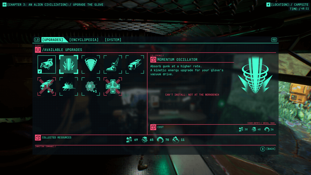 Além de simples desafios de plataforma como pulos ou ativar portas/dispositivos e claro, de aspirar o Gunk e sobrepujar seus simples inimigos, você poderá uma árvore de habilidade. Com sua luva que aspira tudo, você poderá pegar os mais diversos recursos para forjar melhorias. Elas variam tanto de melhorias como mais vida ou potência para sua arma, como pode ser um item completamente novo como uma espécie de mina terrestre.