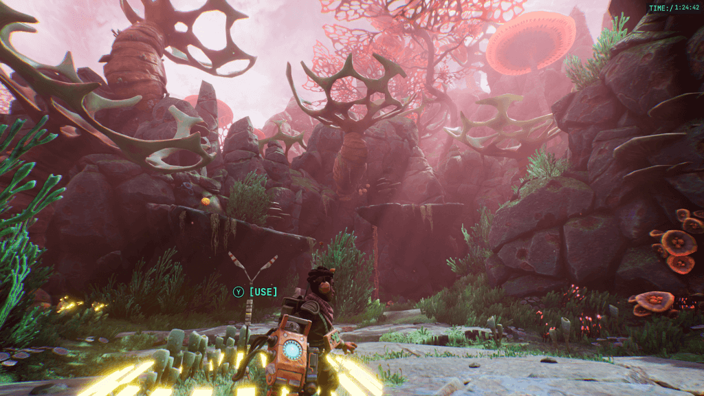 O gameplay é completamente funcional em The Gunk, porém, não empolga por sua simplicidade e facilidade. E devo fazer um pequeno alerta, como joguei a versão pré-lançamento, encontrei alguns bugs como um inimigo que se isolou em um canto de difícil acesso, plataformas recém feitas que não conseguia pular nelas e até uma caverna que depois de limpar todo o Gunk, não me deixou seguir e tive que reiniciar o checkpoint.