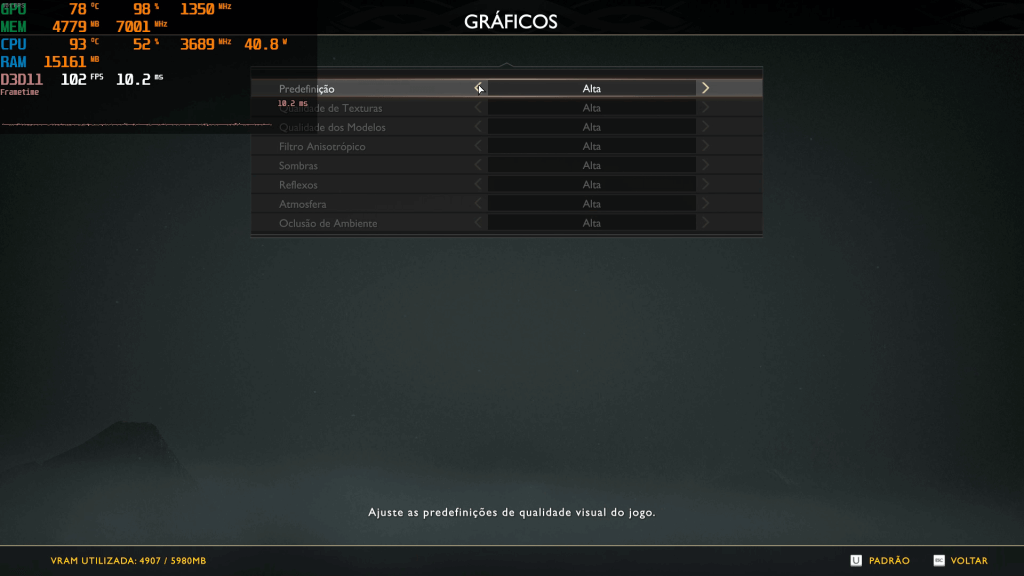 Em certas ocasiões, o uso da GPU fica abaixo dos 80%, sinalizando que ainda há bugs e falta de otimização no jogo, ao menos com relação a essas duas tecnologias. Elas funcionam, mas não da maneira como deveriam. Além disso, vale fazer a observação aqui de que a versão do DLSS utilizada no jogo é a 2.0, que é relativamente antiga e não possui melhorias implementadas nas versões atuais da tecnologia. Um exemplo é o efeito halo no entorno dos modelos, que fica ainda mais perceptível quando renderizamos o jogo em uma resolução menor. Cheguei a tentar fazer um patch manual do jogo para a versão 2.3 para ver se eu conseguiria resolver esse problema, mas nada mudou. É certo que a Santa Monica vai corrigir esse problema, mas por motivos acadêmicos, eu deixo essa nota para vocês.
