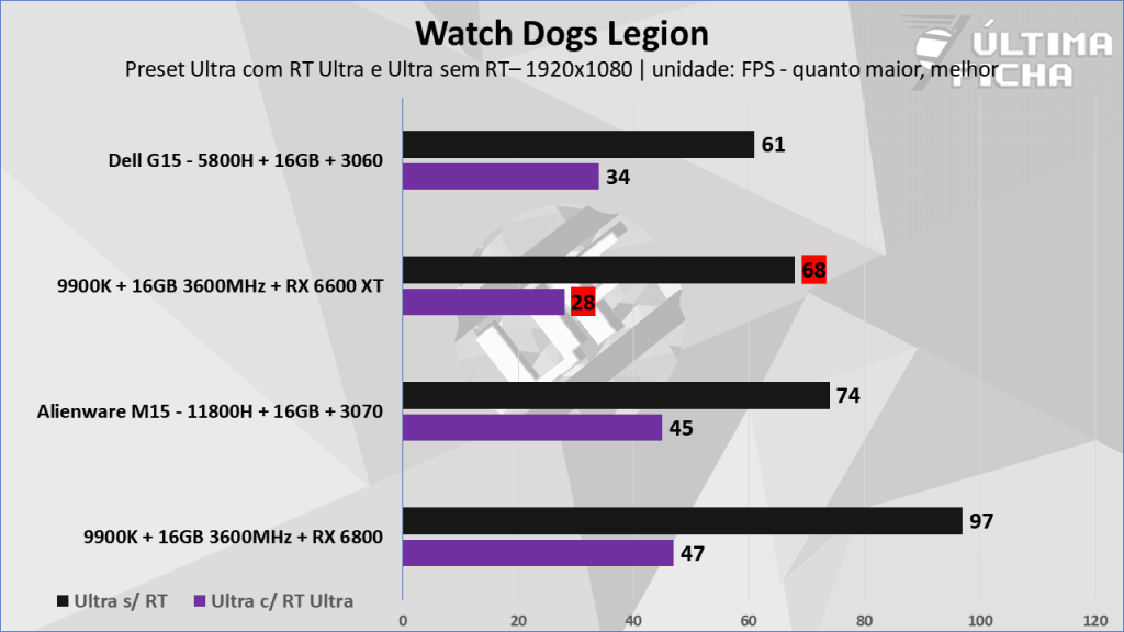 A promessa é cumprida já que os dados mostram que o 1080p é levado de forma bem competente pela RX 6600 XT, mesmo usando as configurações máximas de cada jogo. A exceção ficou para o Watch Dogs Legion com Ray Tracing no máximo, que além de exigir muito da placa, é um título pouco otimizado.