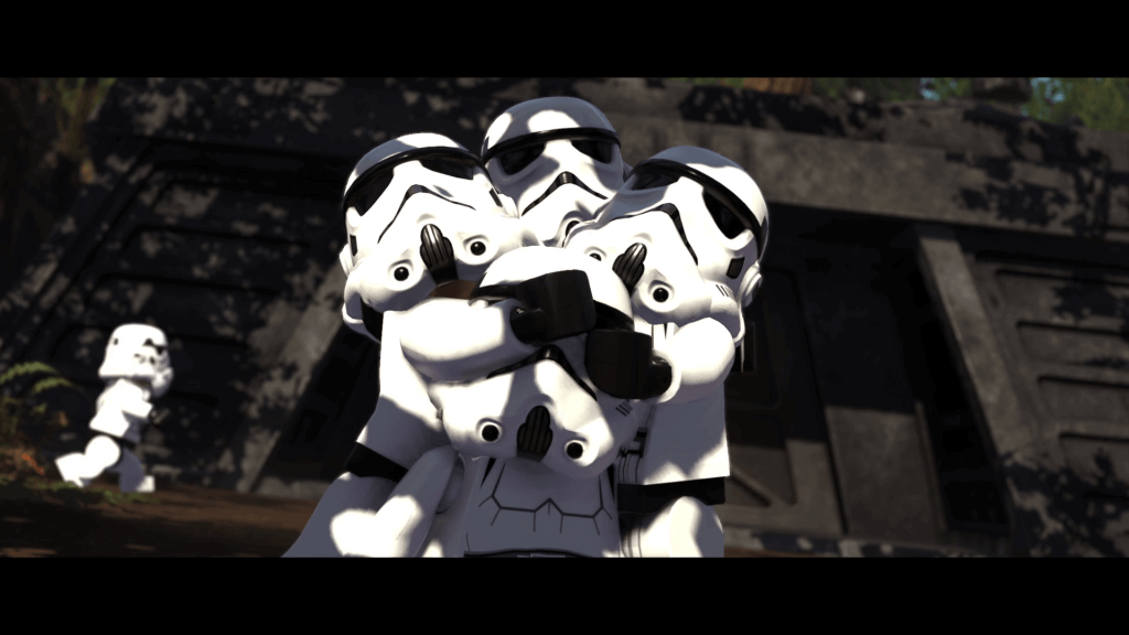 Para complementar essa infinidade de planetas, personagens e veículos, o jogo traz um gameplay extremamente variado, que nos surpreende a cada novo episódio. Há duelos de sabres de luz, tiroteios com blasters, corridas de Pods, batalhas de X Wings e muito mais. Os principais elementos de cada filme foram inseridos no título, e essa alternância evita que o jogo se torne repetitivo, garantindo diversão a cada novo combate. Eu não consigo imaginar o trabalho que os desenvolvedores tiveram para criar as diferentes mecânicas, especialmente levando em conta as dificuldades que a NTT Engine trouxe. Aliás, fica muito claro que o motor gráfico, que foi empurrado goela abaixo pela direção da TT Games, teve impactos de performance no jogo, trazendo não somente bugs e quedas claras de FPS durante todo o gameplay, mas também anomalias no Dynamic Resolution Scaling do jogo. Em planetas mais cheios de vegetação, como Dagobah, a queda na resolução para manter a performance é tão brusca que o jogo fica embaçado, e é possível ver a mudança na resolução de volta claramente assim que chegamos a áreas mais leves. Esse, para mim, é o ponto mais negativo do jogo, e eu pelo menos fiquei aliviado quando soube que a TT Games confirmou que não vai usar mais o motor gráfico no futuro, passando o desenvolvimento dos próximos jogos para a Unreal Engine 5.