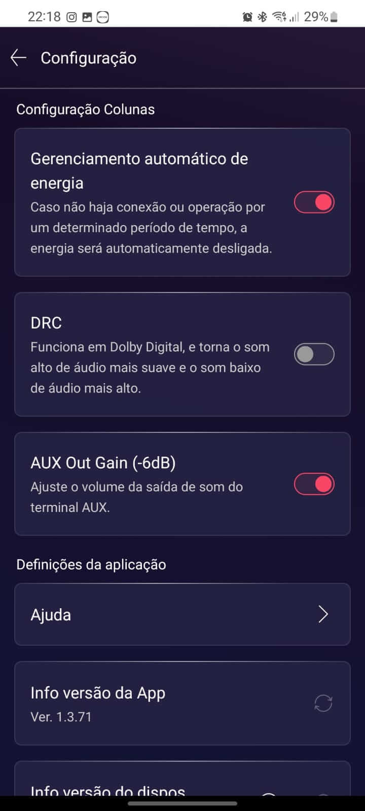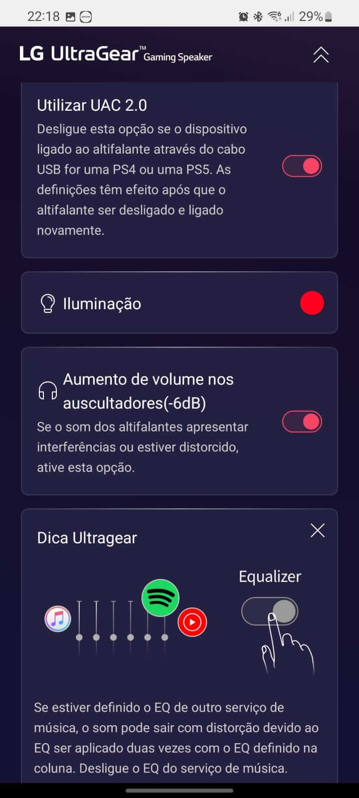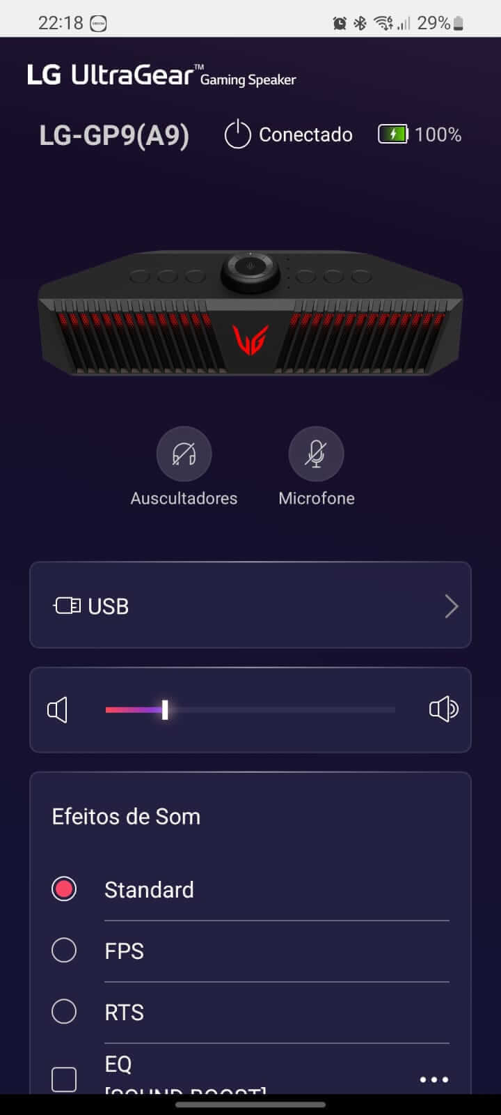 O aplicativo LG XBOOM é competente. Através dele você consegue atualizar o firmware do produto (atualizou duas vezes durante o tempo comigo), alterar a iluminação RGB, personalizar a equalização do perfil EQ (tem botão dedicado) e algumas outras opções. É simples e útil.