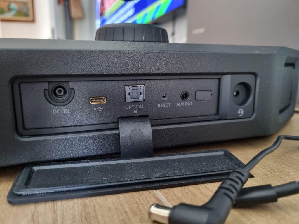 A GP9 possui 3 tipos de conexões para funcionar como um speaker: bluetooth, USB e óptico. Aproveitando que citei entrada USB (tipo C) e óptica, vou completar dizendo que ela tem uma entrada de energia proprietária, um botãozinho de reset (daqueles que você aciona com um alfinete), uma auxiliar P2 e uma P2 dedicada para fones de ouvido. Todas as entradas ficam protegidas por uma tampinha, exceto a P2 dedicada para fones de ouvido.