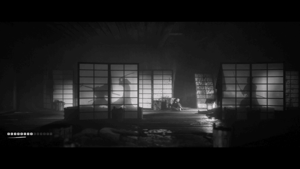 O que realmente coloca a cereja no bolo de toda essa ambientação é a direção de arte, a trilha sonora e a dublagem, todos dignos de prêmio. Trek To Yomi possui um esquema de câmera que lembra muito jogos como Limbo e Inside, que acompanha o jogador lateralmente à medida que ele avança. O grande diferencial do jogo consiste em áreas que permitem uma exploração, mesmo que limitada, e na apresentação cinematográfica inspirada nos filmes clássicos de Akira Kurosawa. Como já explicamos na nossa prévia do jogo, Trek To Yomi faz um uso excelente dos planos da tela para trazer vida ao Japão Feudal, sempre colocando elementos desfocados no primeiro plano e um plano de fundo sempre rico e com animações que dão um certo dinamismo à imagem. Ao mesmo tempo em que o jogo vai apresentando cenas e áreas únicas, sempre maravilhosamente construídas pelos desenvolvedores, ele também vai utilizando as luzes para dar o tom de cada parte do jogo e fazer até referências a outras obras clássicas de samurai.