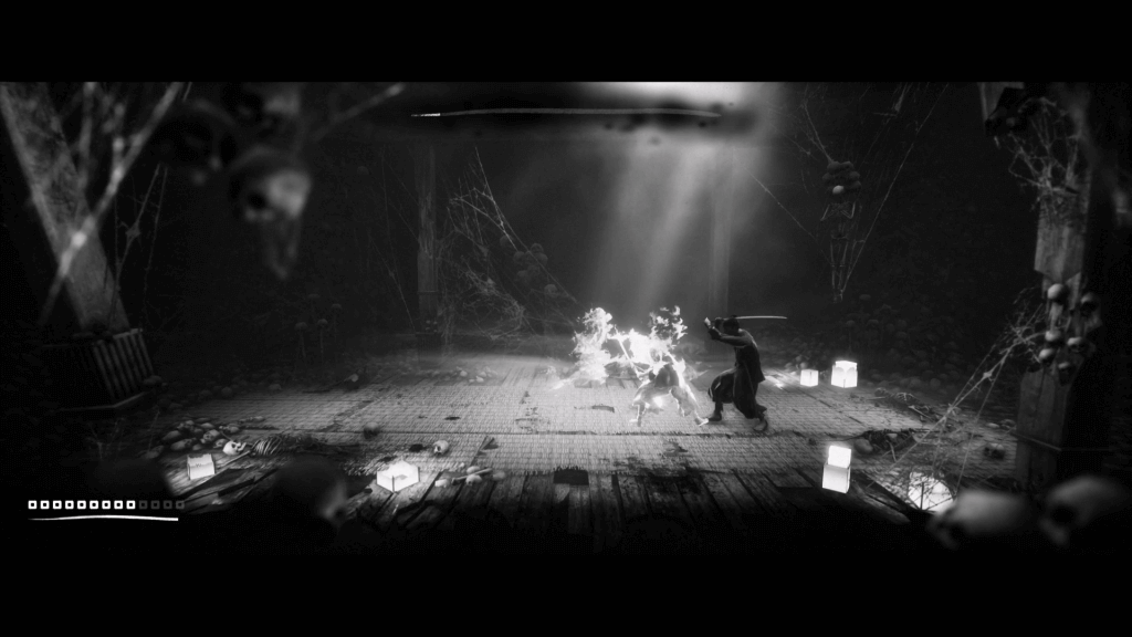 Eu não poderia fechar essa análise sem falar sobre a jogabilidade do jogo em si. Como eu já mencionei, o jogo é um side-scroller à la Limbo e Inside com a adição de pequenos elementos de exploração. Conforme vamos andando pelas diferentes cenas, o jogo permite que o jogador saia do caminho definido e percorra lugares escondidos para encontrar colecionáveis e itens. Entretanto, o grande foco do jogo é, obviamente, o seu combate e eu gostei muito do que joguei. Apesar de ter mecânicas simples, Trek To Yomi traz diferentes combos utilizando os ataques fracos, fortes e a defesa e proporciona encontros desafiadores e visualmente lindos. Timing é chave tanto no ataque quanto na defesa, e o jogo vai exigir que o jogador utilize todo o repertório de Hiroki para passar pelos adversários.
