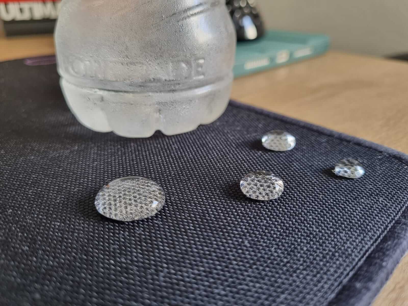 Outro ponto bacanudo do MP510 é o acabamento a prova de água, que eu chamaria de camada liquidofóbica. Fiz um teste jogando água no pad e ela se concentra, não espalha e não é absorvida pelo tecido. Mesmo mexendo com ele, as supergotas apenas deslizam, mas não se desfazem.