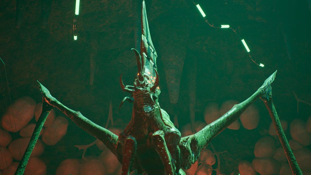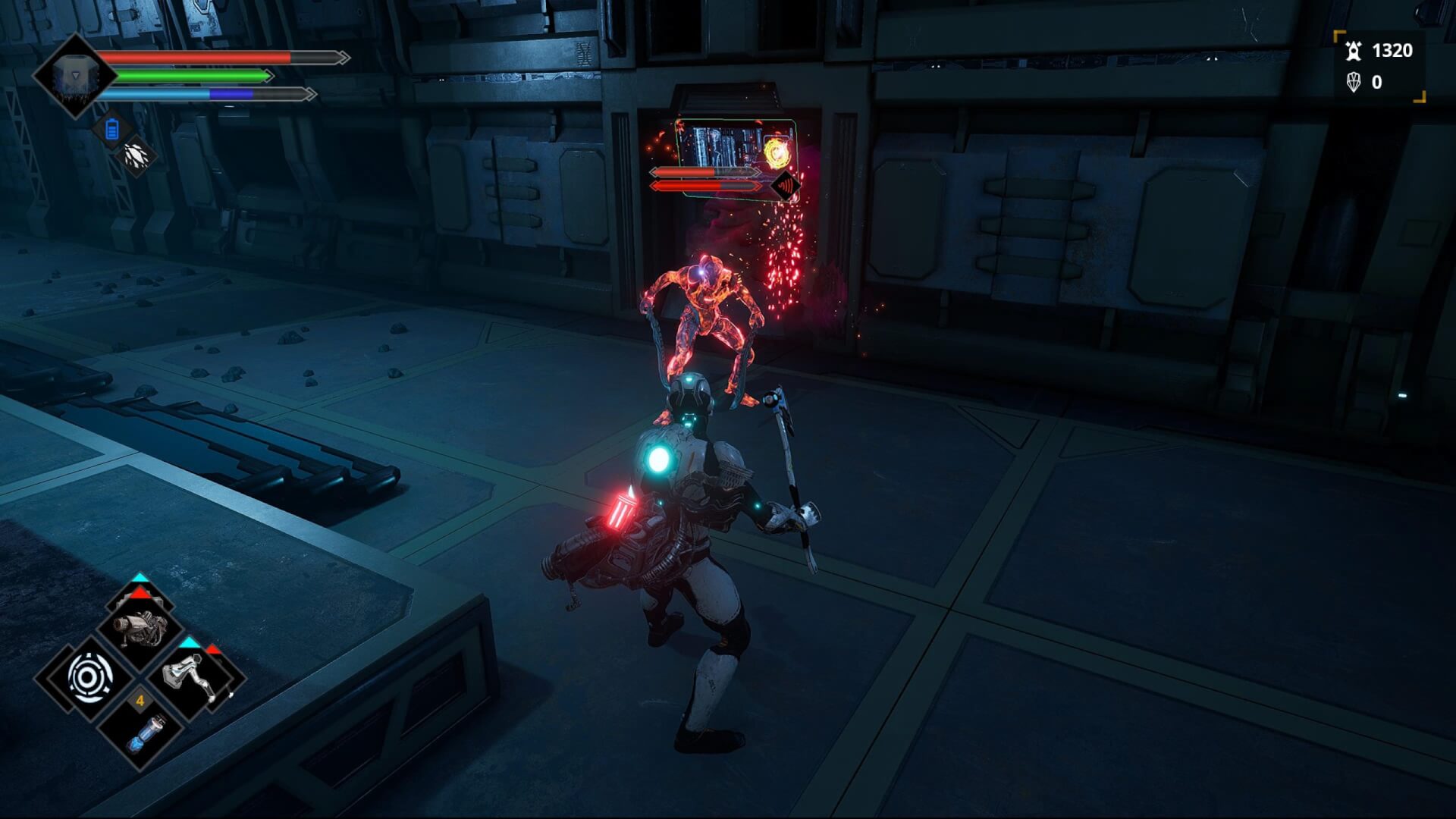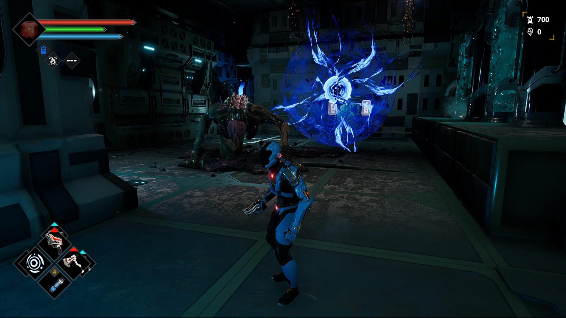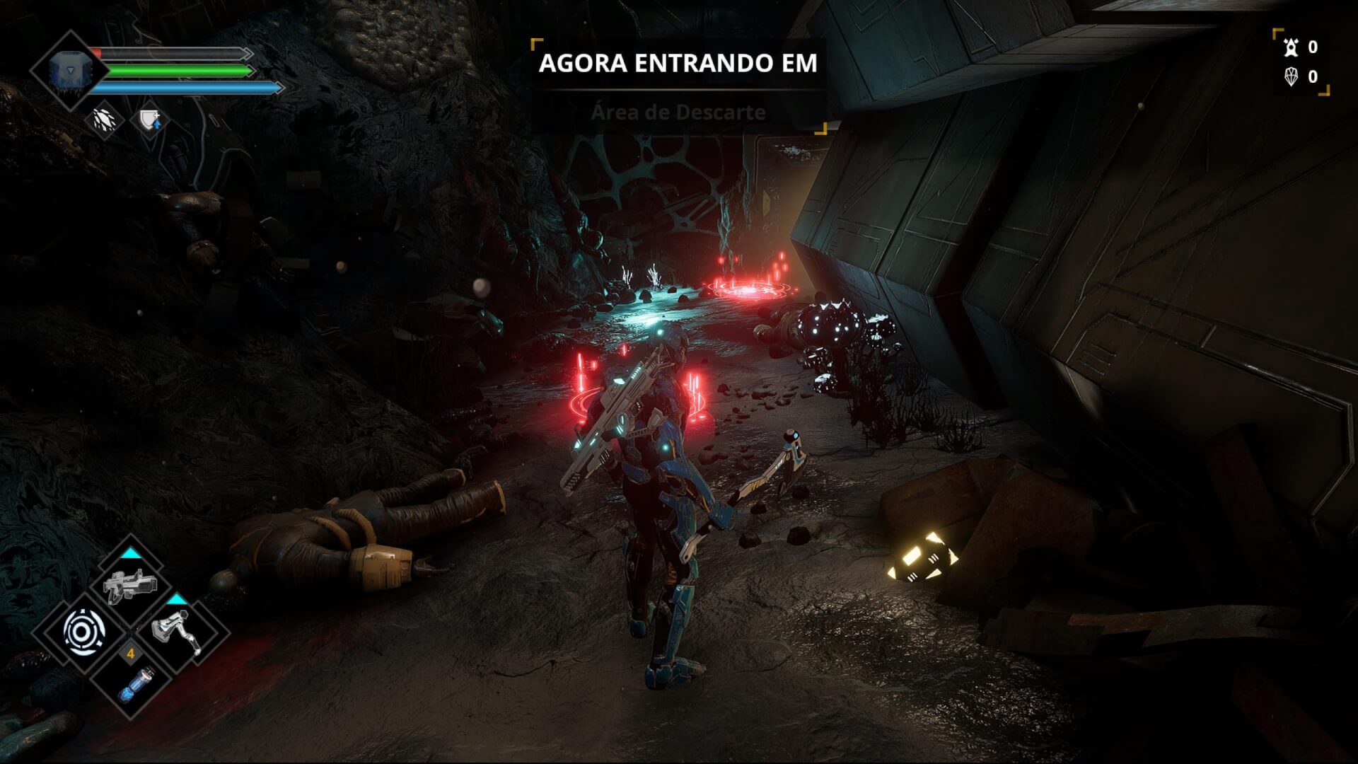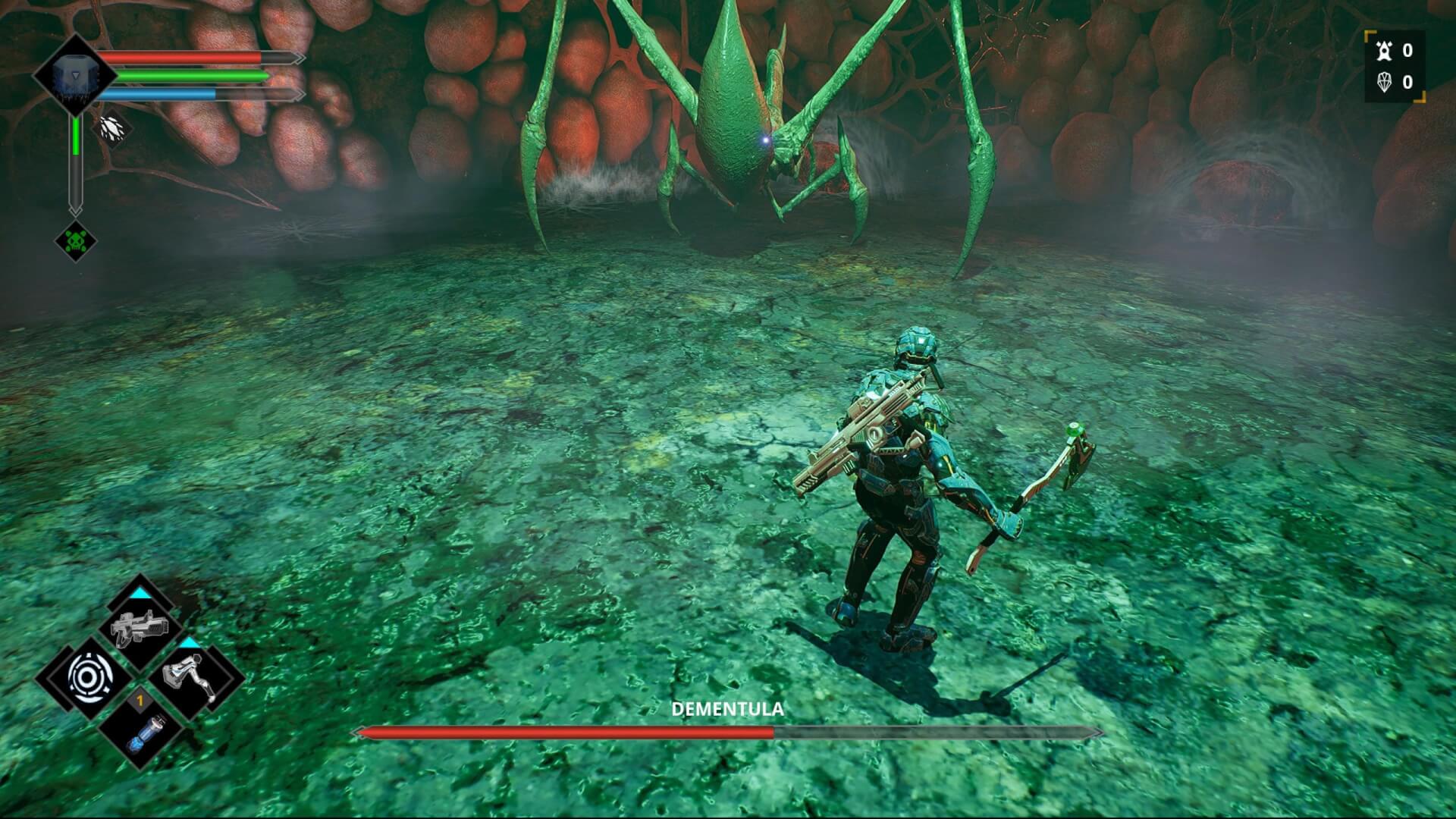 Falando nisso, há diversos tipos de inimigos que variam entre criaturas que parecem insetos e até mesmo aliens humanóides. Enquanto isso, os chefes são bem variados e desde o começo temos batalhas criativas, onde a primeira é tradicionalmente uma criatura grande e forte, enquanto depois temos que lidar com inimigos que tem desvantagem em relação a objetos do cenário e, contra o terceiro chefe, temos uma inimiga que é bastante letal e usa o cenário para o combate. Simplesmente o jogador não cai numa mesmice. Inclusive, o jogo permite que você reviva os chefes para enfrentá-los novamente e assim conseguir recursos para fazer armas que são baseadas neles.