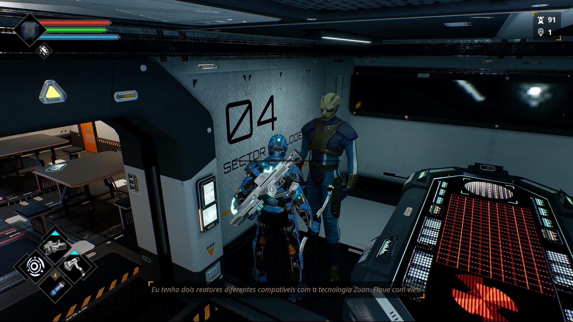 E falando do áudio, ele está muito bom, principalmente se levarmos em conta as vozes dos personagens. O jogo foi feito inicialmente em português e apenas depois foi dublado em inglês. Além disso, o jogo também conta com dois idiomas alienígenas que possuem suas próprias regras gramaticais e até mesmo sotaques para diferenciar os aliens, deixando ainda mais rico o universo do jogo.