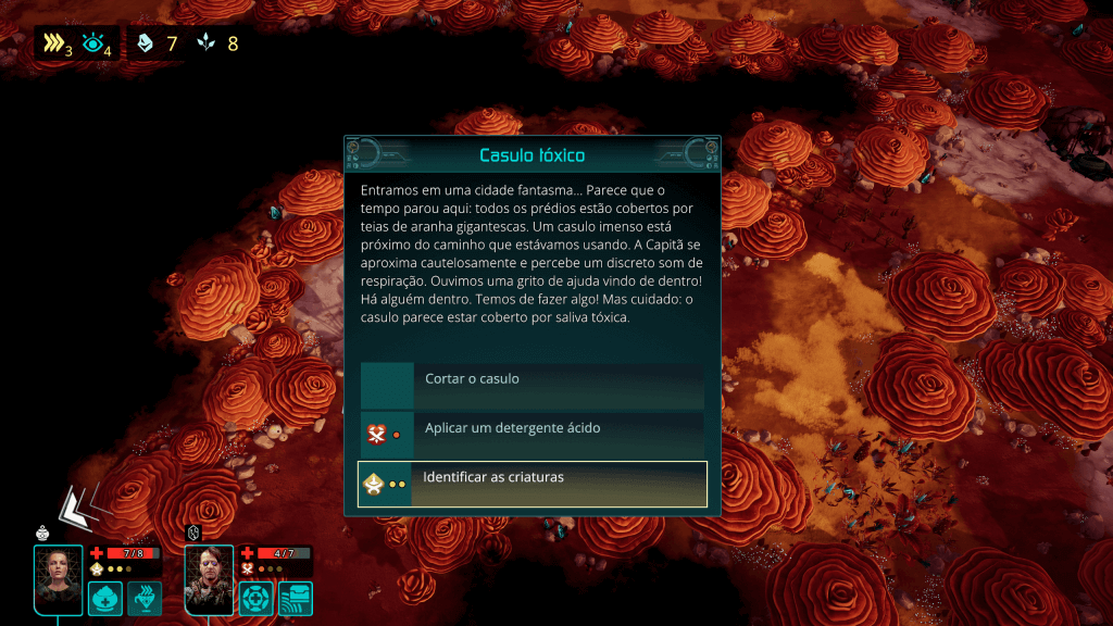 Os personagens também contam com algumas habilidades passivas e ativas, mas eu acabei usando as que serviam para eu me curar quando necessário e dispensei as outras.