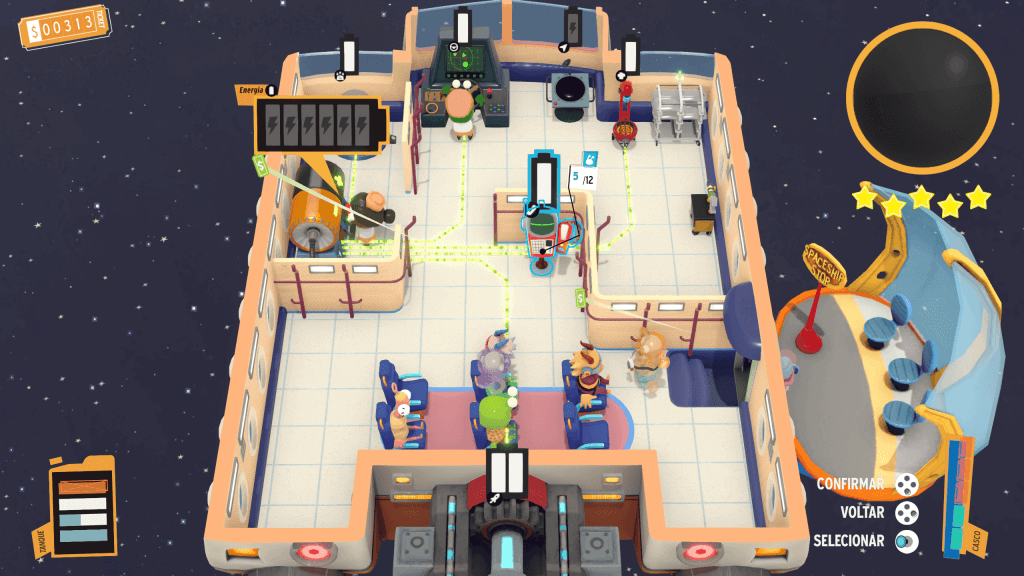 O primeiro grande desafio é saber o que deverá deixar ligado em sua nave. Cada um dos itens como gerador de gravidade, máquina de comida, banheiro, radar, timão e muito mais, irão gastar uma barra de energia (ou pilha) para ser ativado. Ou seja, em algum momento, para ativar um item da sua nave, outro deverá ser desligado.