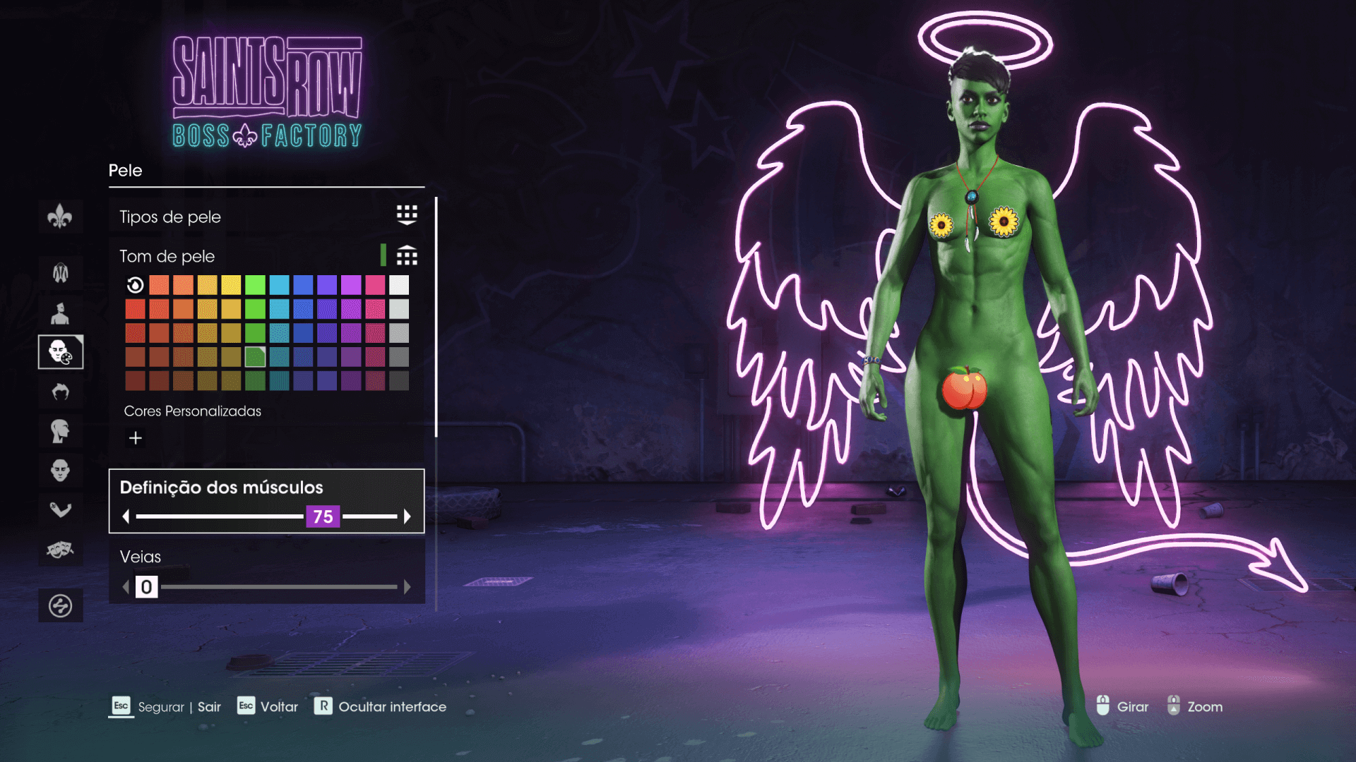 Para se ter uma ideia da quantidade de opções, eu fiquei quase meia hora explorando todas as possibilidades. A customização aqui foi levada a um novo nível onde conseguimos controlar quase todos os detalhes do corpo.