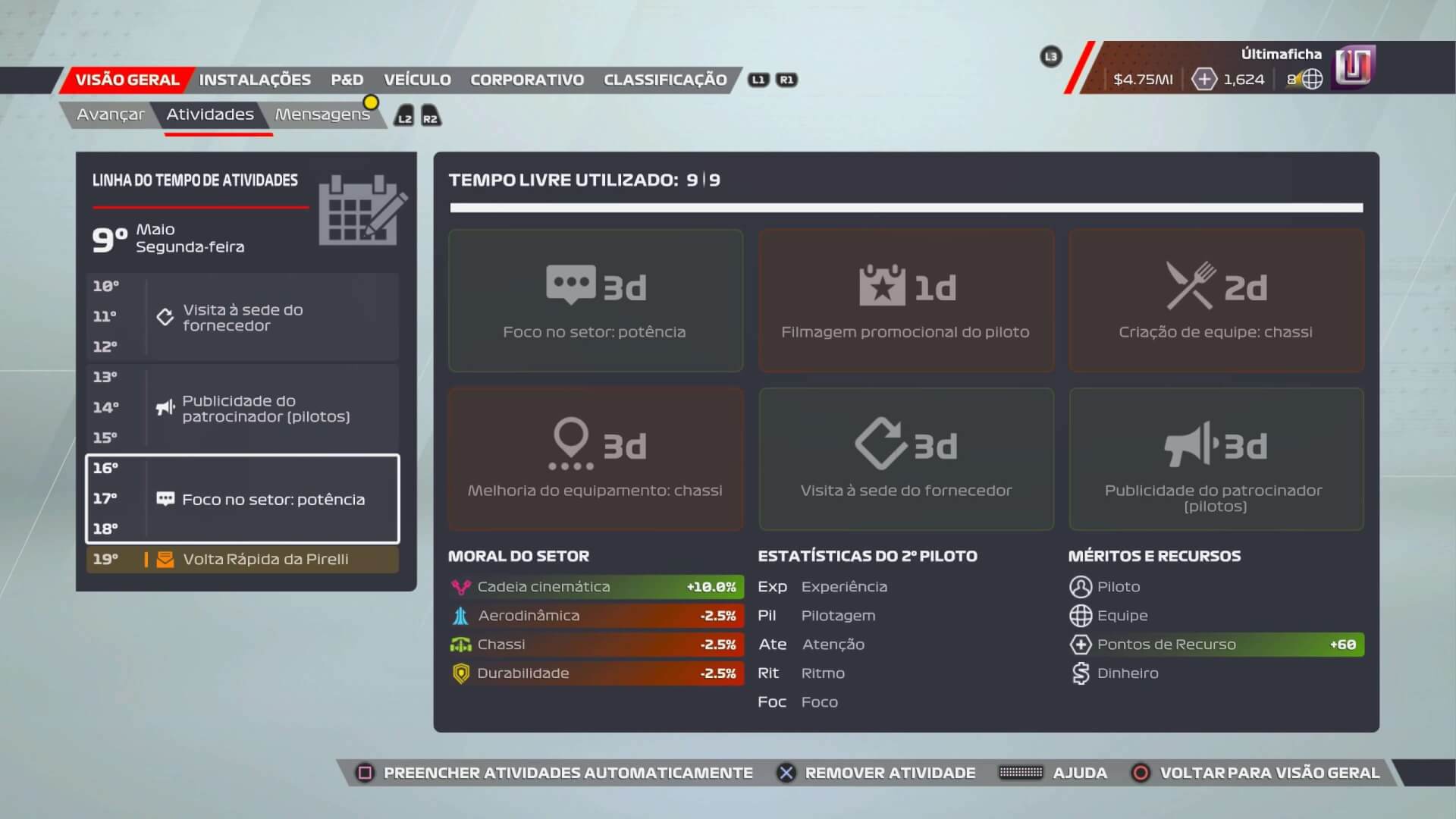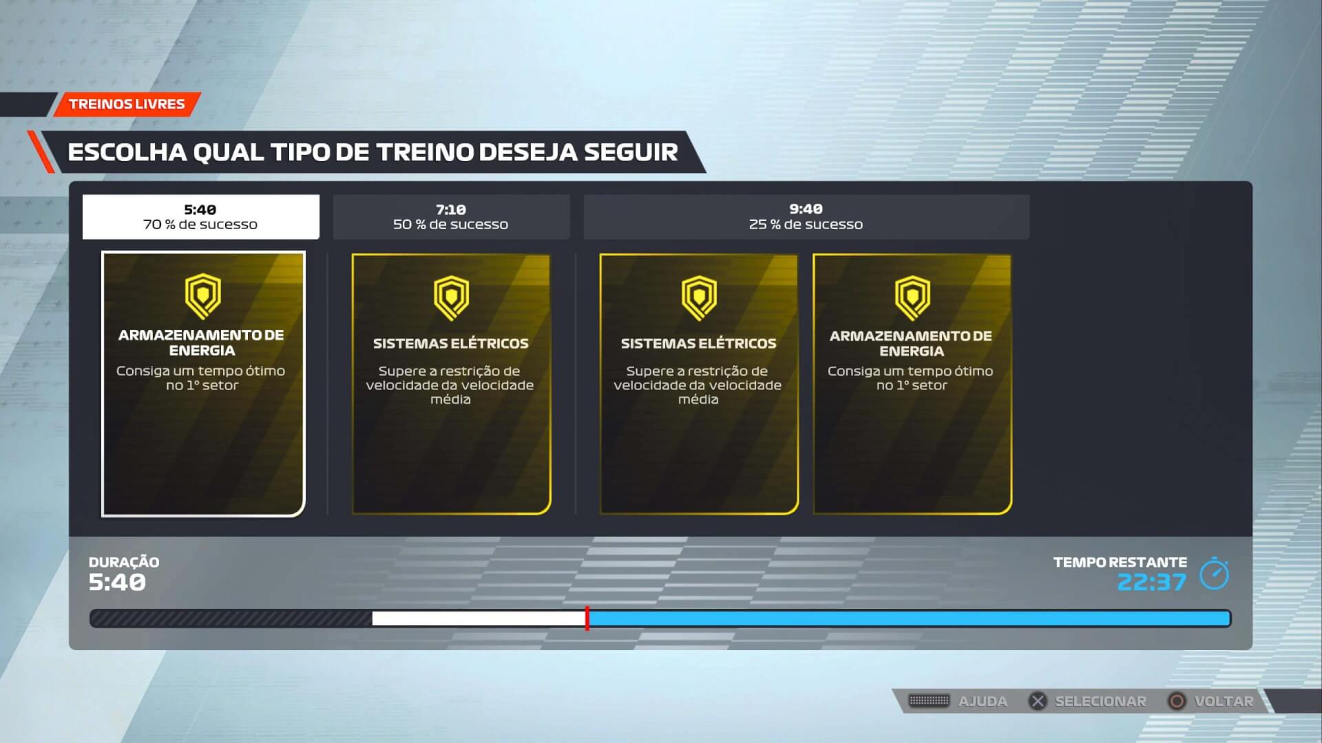 De resto aqui temos o mesmo que vimos no ano passado. Podemos tanto passar pelos programas de treino para ganharmos pontos de evolução do carro como podemos usar o modo automático que acelera o processo, mas que não dá todos os pontos possíveis. Algo importante a dizer é que como o jogo encontra-se mais difícil, agora está mais desafiador completar todas as tarefas.