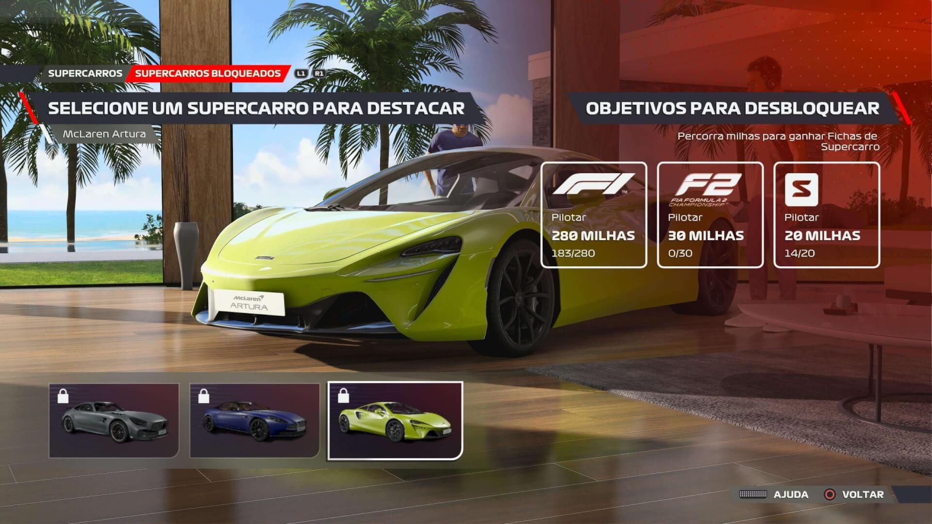 E andando de mãos dadas com essa novidade temos os supercarros. Esses são carros de Turismo que são baseados nas equipes de Fórmula 1, ou seja, temos aqui carros da Ferrari, Aston Martin, Mercedes e McLaren. Com eles poderemos fazer duas coisas. A primeira será exibir os carros nesse hub principal que comentei.