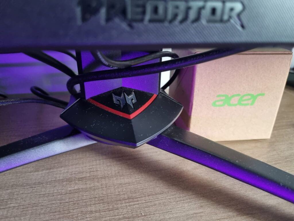 Se você viu nossa análise do Predator de 24 polegadas, também FullHD e de 240Hz, vai notar que eles são irmãos quase idênticos, exceto pelo tamanho. A construção e o design são idênticas. A borda da tela segue revestida em plástico e a base toda em metal. Até o adesivo do NVIDA G-Sync é o mesmo, mas aqui neste modelo ele vem acompanhado de outro adesivo sinalizando que há uma calibração de cor direto de fábrica.