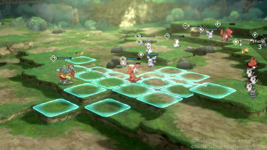 É empolgante ver como adaptaram bem a série dos monstrinhos digitais para esse estilo de jogo, onde podemos colocar até seis digimons para enfrentar os inimigos num tabuleiro de vista panorâmica. Durante o turno de cada personagem você pode movimentá-lo, usar um ataque ou item, onde tudo isso é baseado num número determinado de casas que ele poderá percorrer ou alcançar com a sua ofensiva ou suporte, como se fosse um jogo de tabuleiro.